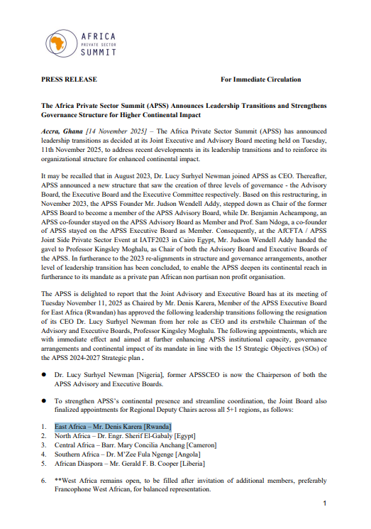 The Africa Private Sector Summit (APSS) was conceptualised in March 2020 and incorporated on September 30, 2021 under the Ghana Companies Act 1991, to bring the African Private Sector together and support the successful implementation of the continent’s Regional Economic Communities (RECs) and The African Continental Free Trade Area (AfCFTA) protocols and principles, already signed by African Heads of States. APSS works to achieve the collective aspiration for Africa’s economic integration as part of a journey to the Africa We Want using an Ecosystem based approach based on the African philosophy of UBUNTU.